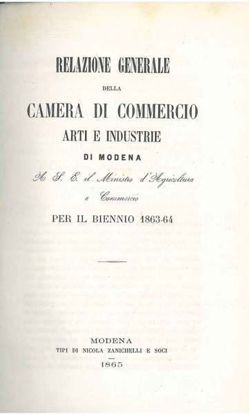 Relazione generale della camera di commercio arti e industrie di Modena. A S. E. il ministro d'Agricoltura e commercio per il biennio 1863-64