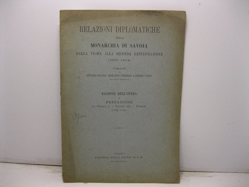 In 8, pp. XX + (2b). Br. ed. Prefazione dell'opera Relazioni diplomatiche della Monarchia di Savoia dalla prima alla seconda restaurazione (1559-1814) uscita in tre volumi fra 1886 e 1891.