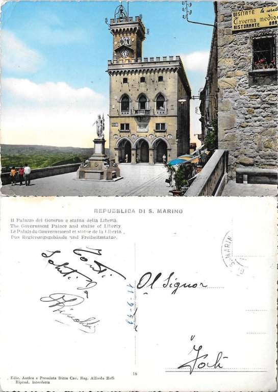 Repubblica di S. Marino. Palazzo del Governo e Statua della Libertà. Viaggiata 1958