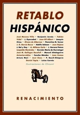 RETABLO HISPÁNICO. Prólogo de Domingo Ródenas de Moya. Ilustraciones de Climent. Colaboraciones de: José Moreno Villa: "Castillos en España", Benjamín Jarnés: "Unamuno, intérprete y nervio de España", Fabián Vidal: "Recuerdos de un periodista demasiado viejo (De la prensa romántica a la prensa de la información)", J. Oyarzabal: "Las rutas de los descubridores", Juan Gil-Albert: "Los levantinos: (de su linaje, existencia y flor)", Joaquín Xirau: "La utopía española", Álvaro de Albornoz: "España y la libertad", Florentino M. Torner: "Aportación de España a la cultura universal", J. D. García Bacca: "El humanismo español", Adolfo Salazar: "el último capítulo de la música en España", Juan Rejano: "Genio y duende de España (Goya y Picasso)", J.