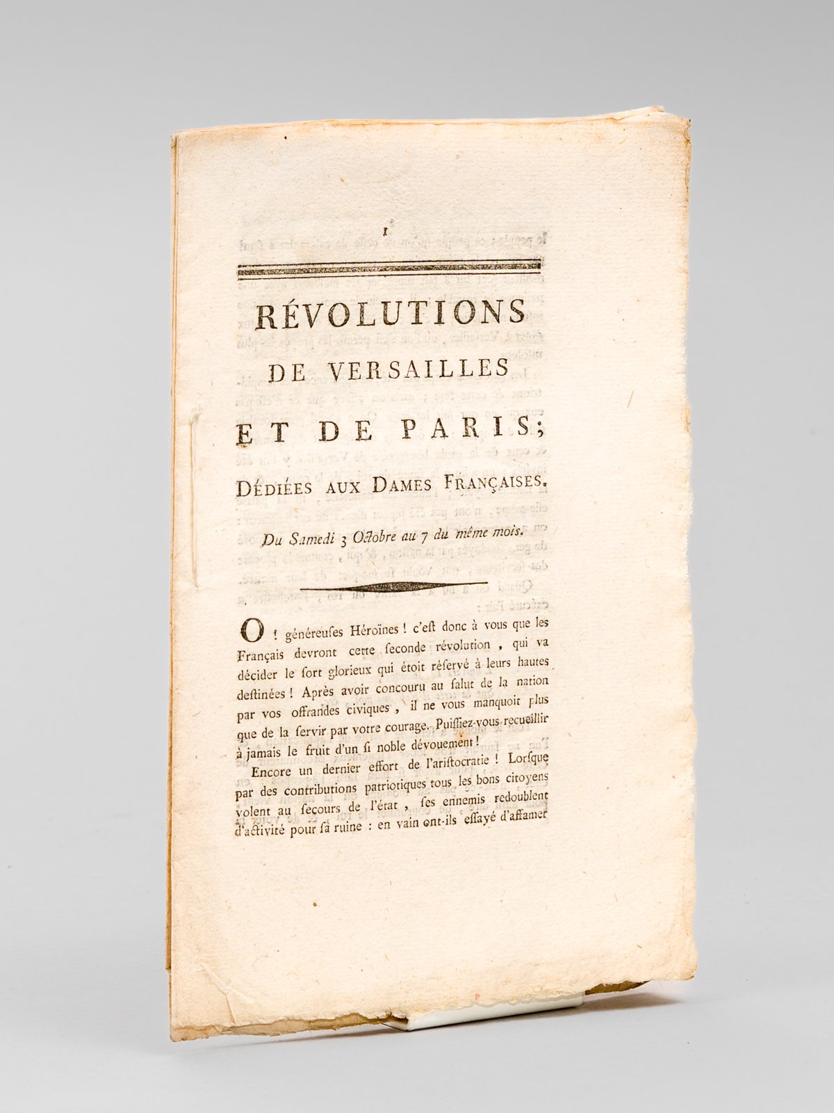 1 brochure in-8, s.n., s.d. [ circa 1789 ], 22 pp. et 1 f. blanc Rare exemplaire du premier numéro de ce journal révolutionnaire, dans un tirage non nommé ni daté, très probablement contemporain de l'édition de Garnery et Volland. Ce journal détaille le rôle des femmes dans les débuts de la Révolution française, notamment lors des journées des 5 et 6 octobre 1789 lorsqu'un cortège de 6 à 7000 femmes marcha sur Versailles pour réclamer du pain : "le décret & la réponse du roi furent aussitôt envoyés à l'hôtel-deville de Paris ; deux ou trois mille femmes assistèrent à sa rédaction ; on peut même dire qu'elles contribuèrent à le former ; car elles s'étaient introduites dans l'enceinte de la salle, & mêlées parmi les députés ; elles votoient comme eux sur les motions & les amendemens. lles exercèrent dont dans cette incomparable journée, les fonctions du pouvoir législatif et du pouvoir exécutif. M. le comte de Mirabeau fit une motion pour qu'elles se retirassent ; mais toutes répondirent qu'elles n'entendaient pas cela, & il fallut bien se résoudre à les avoir pour coopératrices". Tourneux, 10338 ; Hatin, 151