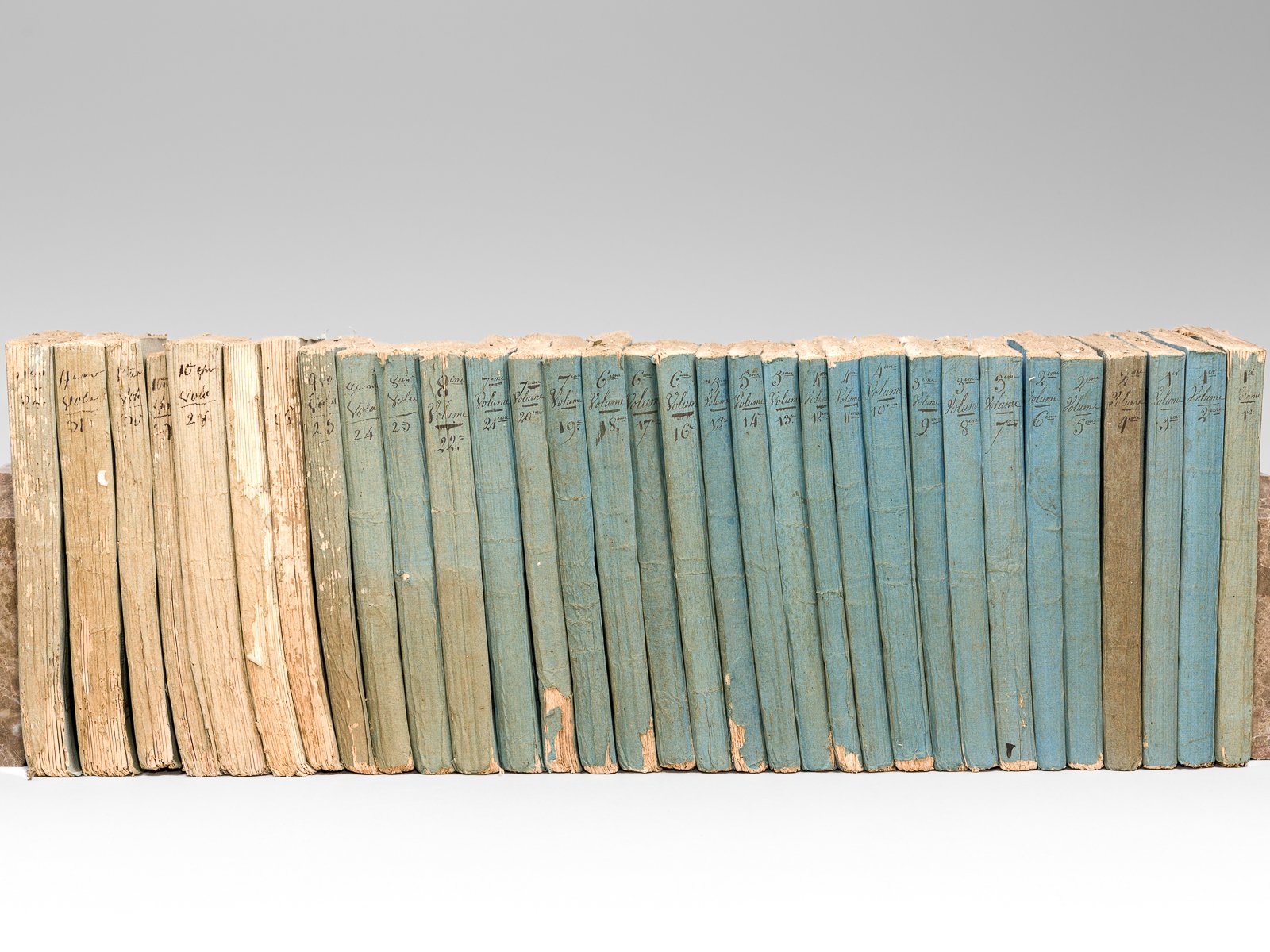 Dans la Littérature, les Sciences et les Arts, 32 vol. in-8 br., Au Bureau de la Revue Encyclopédique, Janvier 1819 à Août 1821, environ 580 pp. par volume (soit un total d'environ 6000 pages) Tête de série peu commune, complète des 10 premiers volumes (avec leurs 30 livraisons), auxquels on joint les 2 premières livraisons du volume 11. Dans sa " Bibliographie historique et critique de la presse", Hatin évoque un recueil "justement estimé, qui compta parmi ses rédacteurs les hommes les plus éminents de l'époque" (Hatin, 569). Etat très satisfaisant (petit grignotage affectant lég. qq. lettres en marge du dernier ff. de la première livraison, couv. parfois frottées avec mq. en dos, bon ensemble par ailleurs) pour cette tête de série peu commune. Remplie d'excellents comptes-rendus d'ouvrages et de biographies (notices nécrologiques), cette revue est non seulement un instrument bibliographique remarquable, mais également un ouvrage passionnant, qui intéressera tout homme cultivé. Le Grand Larousse est d'ailleurs aussi clair qu'élogieux à son propos : "Jamais publication périodique ne justifia aussi pleinement son titre. A vrai dire, c'est la seule revue que la littérature française ait possédée. Voici le plan sur lequel ses fondateurs l'avaient établie : exposer avec précision et avec fidélité la marche et les progrès successifs des connaissances humaines [ . ] ; rechercher et consulter les ouvrages les plus instructifs et les plus utiles, pour en donner un compte-rendu exact et impartial ; analyser les principaux travaux scientifiques et littéraires, historiques, économiques et politiques ; insérer des mémoires originaux, des notices diverses ; résumer la substances des journaux spéciaux [ . ]" (Larousse, GDU, XIII, 1130). On y découvre la science, la littérature, les arts et l'histoire dans tous leurs développements, en ce début du XIXe siècle. On y passe d'un article de Moreau de Jonnés "Sur le tremblement de terre qui a eu lieu à Sainte-Lucie" à la recension de l'ouvrage de Jomard sur son "Voyage dans l'intérieur de l'Afrique", en passant par un "Tableau météorologique représentant les variations de la température en 1819" (Jullien), une "Notice sur l'exposition annuelle des produits des manufactures royales" ou un compte-rendu de Lanjuinais sur les "Recherches sur les Langues tartares" par Abel Rémusat.