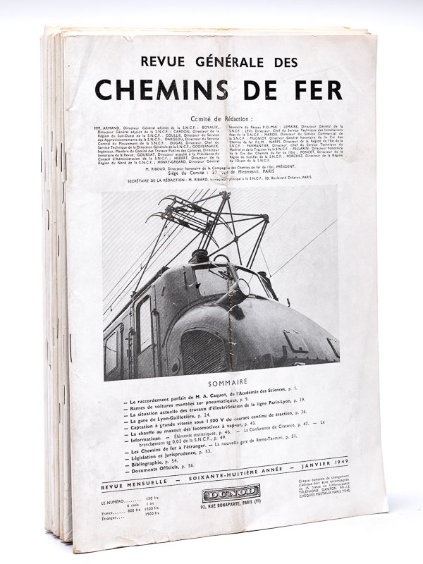 12 numéros in-4 br., Revue Générale des Chemins de Fer, 1949, 580 pp. Au sommaire notamment : La chaïne de fabrication ds wagons à primeurs de la SNCF ; Un autocar sur rails, l'autorail Floirat et sa remorque ; le wagon-instruction freins de la Région du Sud-Ouest ; La théorie de la chaleur et le chauffage électrique des voitures de chemin de fer ; TRains de pélerinage, méthodes utilisées pour la rotation ; La gare de triage de Tergnier ; les locomotives à vapeur type 241-P ; Mesure de la résilience des rails ; La traction Diesel-électrique dans les territoires d'outre-mer ; L'éclairage des chantiers de triage à la SNCF ; l'emploi du sabot enrayage ; les locomotives électriques à courant continu 1500 volts ; rail américain et rail français ; La reconstruction des ponts métalliques de la ligne de Vierzon ; les essais de la première locomotive électrique du prototype CC ; un appareil à enregistrer les chocs des wagons ; la construction en acier doux soudé d'une rame sur pneumatiques ; la transformation des gares de Dijon et Perrigny ; la locomotive électrique CC 7001 ; les transports ferroviaires en zone française d'occupation en Allemagne ; le nouveau triage de Toulouse-Saint-Jory ; la nouvelle gare maritime du Havre ; les poteaux en béton précontraint utilisés pour supporter la caténaire sur la ligne Paris-Lyon ; La traction électrique sur la ligne -ParisLyon et la formation préalable du personnel spécialisé ; Les câbles téléphoniques de la ligne de Paris à Lyon ; Amélioration des locomotives Mikado de la Région de l'Ouest ; La reconstruction du Pont de Roppenheim ; Captation à grande vitesse sous 1500 V du courant continu de traction ; La gare de Lyon-Guillotière. Complet des 12 numéros de l'année 1949. Etat très satisfaisant (qq. couv. lég. frottées). Prix du lot non séparable.