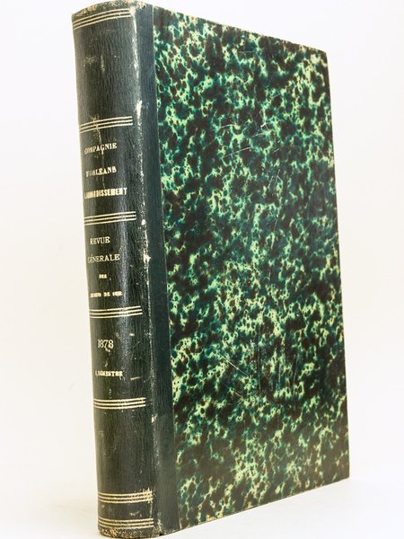 1 vol. in-4 reliure demi-basane verte, Revue Générale des Chemins de Fer, Juillet - Décembre 1878, 445 pp. avec 31 planches hors texte (le plus souvent sur double page, souvent dépliantes). Au sommaire notamment : Note sur quelques nouveaux appareils destinés à l'armement de secours ; Note sur le transport des petits paquets d'un poids égal et inférieur à 5 Kg ; Recherches sur la puissance de vaporisation des locomotives en relation avec le tirage ; Note du la nouvelle gare de Bologne (Italie) ; Note sur l'utilisation des déchets de boites à fulée des locomotives ; Note sur le système de décalque au papier sensible ; Note sur le règlements des signaux en vigueur sur les chemins de fer allemands ; Notes sur les essais du frein à vide système Smith ; Considérations théoriques sur l'arrêt d'une train au moyen d'un système de freins continus ; Note sur le pousse-wagon ; La voie ferrée à l'Exposition universelle de 1878 : Traverses mixtes et traverses métalliques ; De l'influence du profil de la voie sur les dépenses d'exploitation ; Note sur le frein automoteur à friction ; Note sur le wagon d'expériences du chemin de fer de l'Est ; Note sur les essais d'éclairage électrique faits à la Gare de La Chapelle ; Résumé d'une étude technique sur le chemin de fer de Festiniog ; Poids d'un vérin à manivelle ;Locomotives_tender à deux et à trois essieux accouplés de l'Exposition Universelle de 1878 ; Serrage des frein par l'air comprimé, système Westinghouse automatique. Très rare exemplaire de l'édition originale du premier tome de la célèbre "Revue Générale des Chemins de fer". Bon exemplaire bien complet des 31 planches hors texte (fente partielle en pliure en dernière planche, reliure lég. frottée)