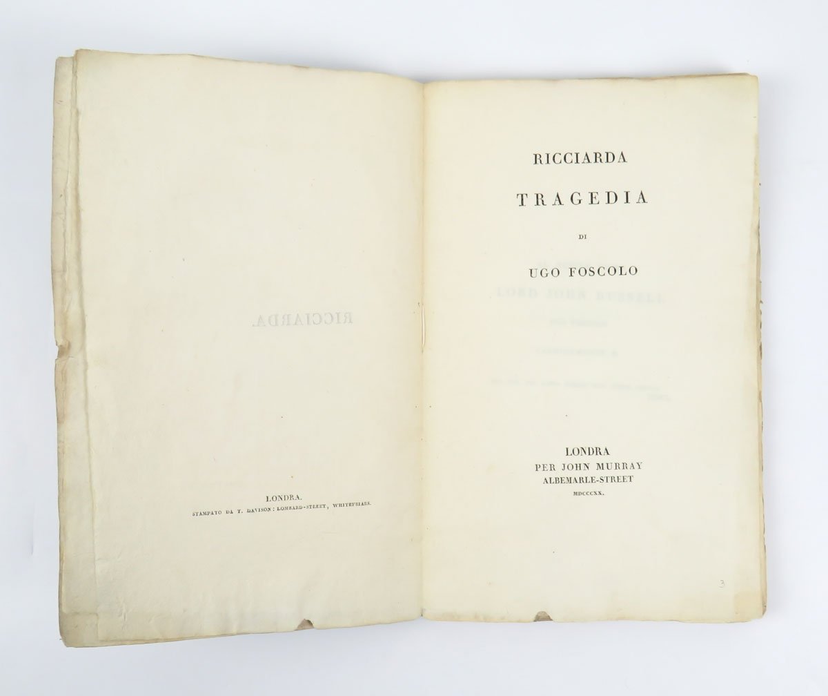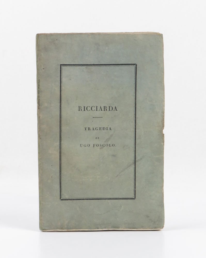 LIBRO Contraffazione torinese. Ottimo esemplare in barbe nella brossura originale (restauro professionale al dorso). Contraffazione dell’edizione originale, «uscì dai torchj della vedova Pomba e Figli nel mese di giugno 1820 e rappresenta una perfetta imitazione della londinese anche nella scelta dei caratteri, a quella del tutto simili seppure lievemente più marcati» (Raccolta foscoliana Acchiappati). L’Acchiappati elenca nel dettaglio le differenza tra l’originale e questa edizione, ma basti qui ricordare il solo elemento strutturale del numero di pagine: 96 nella contraffazione, 101 [1] nell’originale. Raccolta foscoliana Acchiappati, n. 98; «Edizione Nazionale delle opere di Ugo Foscolo», cur. Bezzola, Firenze 1961, vol. 2, p. XLIX; Ottolini, «Bibliografia foscoliana», p. 39