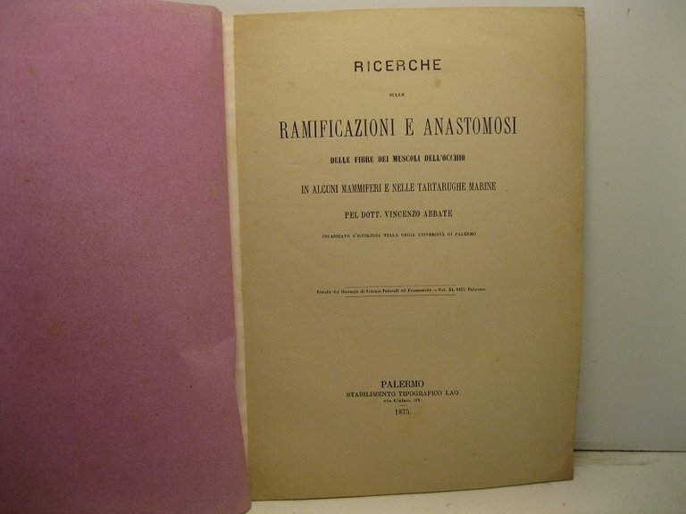 Ricerche sulle ramificazioni e anastomosi delle fibre dei muscoli dell'occhio in alcuni mammiferi e nelle tartarughe marine. Estratto dal Giornale di Scienze Naturali ed Economiche, vol. XI, 1875