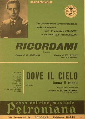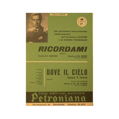 Arrangiamento di Amadesi A. - Un'interpretazione radiotrasmessa dall'Orchestra Filippini e da Sandra Tramiglini - Premiata al 3° Festival della canzone Ligure e Prescelta per la finale del 1° Festival internazionale di Nizza - in 8° - pp.15 - Brossura editoriale illustrata - Partitura per Pianoforte, Saxofono Contralto, Saxofono Tenore, Violino/Fisarmonica, Tromba e Contrabbasso/Chitarra