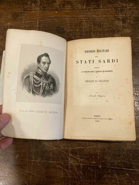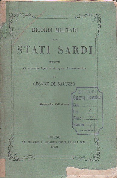 In-8° (210x140mm), pp. (6), 479, brossura editoriale verde a stampa. Antiporta con ritratto litografico del Saluzzo di Monesiglio inciso da Doyen. Buon esemplare (alcuni restauri alla brossura). Entro velina Seconda edizione (la prima era apparsa in francese) di questa miscellanea di scritti militari del Saluzzo di Monesiglio (Torino, 1777-ivi, 1853), desunti sia dalle sue opere a stampa che da lavori prima inediti. Cesare Saluzzo di Monesiglio (Torino, 1777-ivi, 1853), fratello di Alessandro, fu scrittore militare e accanito bibliofilo, nonché appassionato di archeologia (a lui si deve la commissione di importanti scavi effettuati a Pollenzo). Comandante dell'Accademia Militare di Torino dal 1821 al 1830, in questo stesso anno divenne precettore dei figli di Carlo Alberto; in seguito ricoprì la carica di presidente della Regia Deputazione degli Studi di Storia Patria. Scrive lo Sticca: 'Fu di Alessandro più studioso, piàù accurato, più dotto. nella patria lingua poi riuscì forbito, purgato, puro. Egli intitolò Souvenirs militaires des Etats Sards un volume contenente esempi storici - ad esaltazione della milizia - di fortezza, di onore, di amor patrio: non gran cosa, nè omogenea, nè limata, ma encomiabile per gli elevati sensi che l'informano, e che godette un quarto d'ora di celebrità e venne, nel 1854, recata in italiano per cura della Societ torinese degl'Insegnanti' (p. 207).