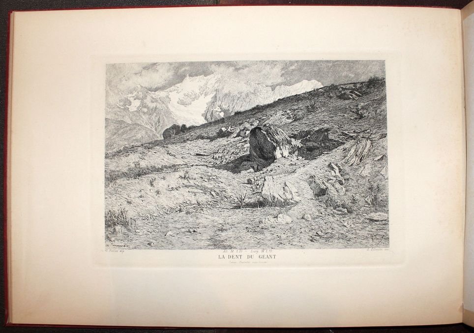 Album cm. 33,5 x 23,5. Pp. 32, (2). Leg. percallina rossa con titoli oro in cornice ornamentale. Copia in buono stato. Con 7 tavole fuori testo, 3 di queste litografiche (Una vecchia berlina [Sardegna] di Giovanni Battista Quadrone, Tonio il galante di Vittorio Cavalleri e Le Dent du Géant di Carlo Follini) riproducenti alcune delle opere esposte.