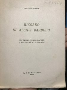 RICORDO DI ALCIDE BARBIERI. CON PAGINE AUTOBIOGRAFICHE E UN SAGGIO DI TRADUZIONE