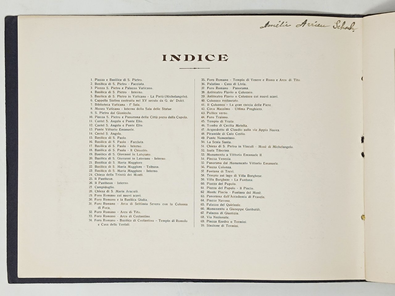 Serie n° 191244. Illustrazioni in monocromia. Senza data. Didascalie in italiano, francese, inglese, tedesco. Legatura con cordoncino. Formato in oblungo (26 x 20 cm circa). Bella copertina con fregi e decorazioni in oro e in blu in rilievo e stampa panoramica applicata sul piatto. Ciascuna tavola è numerata. Stato di conservazione: esemplare decisamente ben conservato. Privo di segni a penna o a matita.