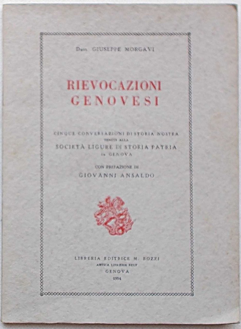 In 8° (cm. 24,5 x 18); pagg. 108; leggera cartonatura originale illustr. Bruniture ai tagli, ma ottimo. VG. ** "Cinque conversazioni di storia nostra tenute alla Società Ligure di Storia Patria".