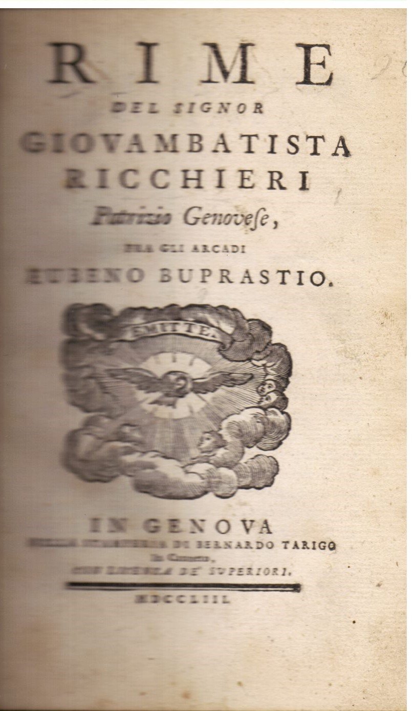 2 opere in un volume in-8° (185x130mm), pp. (16), 244, (8); (14), 77, (3); legatura in piena pelle marrone con piatti coevi con bordura reticolata incisa a secco e dorata (sbiadita), dorso posteriore con titoli in oro al dorso, tutti i tagli tagli blu. Impresa tipografica in xilografia al frontespizio della prima opera e vignetta ornamentale incisa al secondo frontespizio, alcuni capolèttere ornati. Difetti alla legatura, interno fresco: buon esemplare. Edizione originale di queste due raccolte poetiche, in cui i componimenti sono dedicati principalmente a illustri cittadini genovesi, costituente un significativo documento della vita sociale della Genova di metà Settecento e, insieme, di poesia a carattere didascalico-scientifico e filosofico. Non mancano componimenti consacrati al sistema copernicano, alle stelle fisse, al moto ellittico dei pianeti, all'aurora boreale, agli ipotetici abitanti della Luna, di Mercurio, di Marte e degli altri pianeti allora noti del Sistema Solare, al fulmine e ad altri fenomeni celesti, alle maree, etc., tutti oggetto di ingegnosa versificazione. Manca al Manno.
