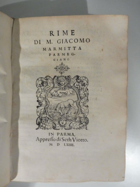 In 8 (cm 15 x 21), pp. (8) + 198 + (1) di errata + (1b) + (8) di indice. Pergamena rifatta. Marca tipografica illustrata al frontespizio raff. il liocorno che si abbevera al fiume, capilettera xilografati. Edizione originale di questa raccolte di rime di Giacomo (Jacopo) Marmitta (1504-1561) autore di versi dai temi vari, dalle ammonizioni alle donne lascive alle descrizioni sensuali della bellezza femminile, dalle liriche religiose a quelle patriottiche. Lo stampatore, Viotti Set, era figlio di Antonio, da cui eredito' la tipografia paterna che condusse per oltre trent'anni in piazza dei servi a Parma.