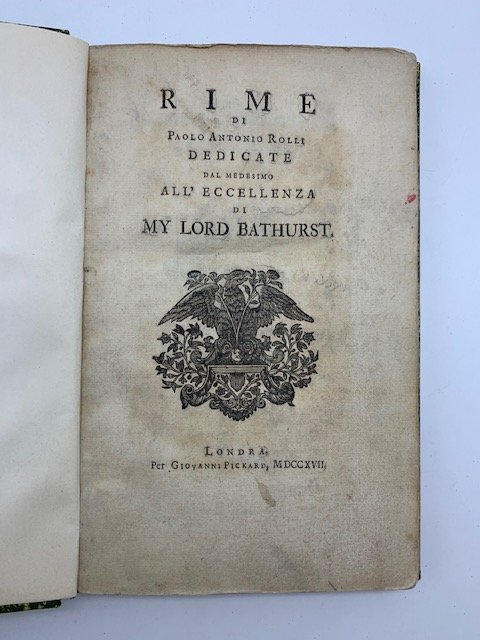 In 8 (cm 14,5 x 23), pp. 158 + (1) con insegna tipografica + (1 bianca). MANCA la prima carta con l'antiporta illustrata. Lieve mancanza al margine inferiore delle ultime due carte. Lieve gora al margine esterno delle ultime 14 carte. Legatura moderna in cartonatura con tassello in pelle al dorso. Edizione originale di questa raccolta poetica, in cui compaiono per la prima volta le poesie per musica dell'autore, comprendente: 14 endecasillabi, 10 odi, 10 elegie (gli ultimi due componimenti numerati entrambi come elegia IX), 10 sonetti e 12 canzonette. "La produzione canzonettistica e cantatistica di Rolli va ricondotta in buona parte a quel fervido desiderio di diffondere la cultura italiana in Inghilterra, attraverso la pubblicazione di raccolte poetiche, traduzioni letterarie, drammi e componimenti per musica, che caratterizzo' l'attivita' del poeta fin dal suo arrivo a Londra tra la fine del 1715 e l'inizio del 1716" (Giacomo Sciommeri, Dolcissima fassi la musica e la favella: Paolo Rolli poeta per musica europeo, 2018, pp. 55-56).