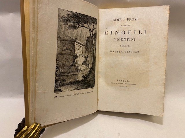 Elegante legatura di inizio '900 in tutta pelle con grande fregio decorativo in oro al piatto, titolo e filetti oro al dorso, taglio superiore dorato, ottime condizioni. Bella tavola incisa in antiporta raffigurante il monumento eretto a Corfù alla memoria di un cane e altra tavola f.t. raffigurante un cane San Bernardo. L'opera contiene un discorso storico sui cani di Gio. Battista Roselli, seguono 6 Prose e 12 Poesie coi relativi autori. Sc. D.