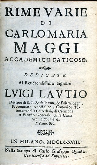 Rime varie. Dedicate al Reverendissimo Signore Luigi Lautio Dottore di S. T. & dell'una, & altra legge, Protonotaro Apostolico, Canonico Tesoriero della Cattedrale di Cremona, e Vicario Generale della Curia Arcivescovile di Milano