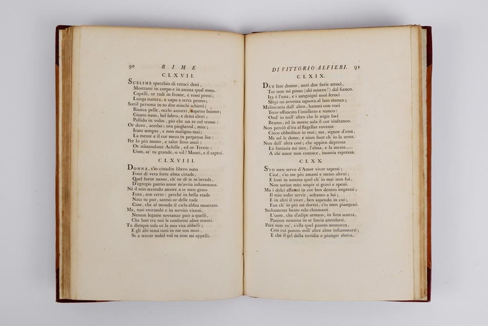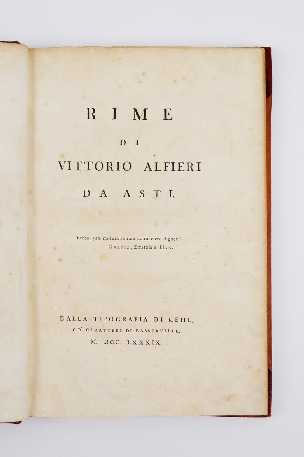 LIBROEditio princeps.Ottimo esemplare, fresco e marginoso. Tracce di colla di antico ex libris al contropiatto anteriore.Prima edizione delle «Rime» di Alfieri, leggendaria per la sua rarità: in Italia ne è censita una sola copia nel catalogo Sbn, presso la Biblioteca di Casa Carducci a Bologna. C. Del Vento, che ha in preparazione l’edizione critica, nel suo fondamentale articolo «L’edizione Kehl delle “Rime” di Alfieri» riferisce di sole altre tre copie conosciute, tutte in sedi prestigiosissime: presso la Bibliothèque de l’Istitut de France (8° Q 728 VII), la Bibliothèque de l’Assemblée Nationale (Exii 301) e la British Library (1063.1.3.1). In OCLC-WorldCat è censito un esemplare anche presso la Mediathèques de Montpellier. L'avvincente storia editoriale delle «Rime» di Alfieri è ricostruita dallo stesso poeta nelle pagine della sua «Vita». Mentre si trovava in Alsazia, si recò con l’amico Tommaso Caluso di Valperga a visitare «la famosa tipografia stabilita in Kehl grandiosamente dal Signor di Beaumarchais, coi caratteri di Baskerville comprati da esso, e destinato il tutto alle molte e varie edizioni di tutte le opere di Voltaire. La bellezza di quei caratteri, la diligenza degli artefici, e l’opportunità che mi somministrava l’essere io molto conoscente del suddetto Beaumarchais dimorante in Parigi, m’invogliarono di prevalermene per colà stampare tutte l’altre mie opere che tragedie non erano; ed alle quali avrebbero potuto essere d’intoppo le solite stitichezze censorie, le quali esistevano allora anche in Francia, e non picciole» (V. Alfieri, «Vita scritta da esso», in «Opere», I, introduzione e scelta di M. Fubini, testo e commento a cura di A. Di Benedetto, Milano-Napoli, Ricciardi, 1977, p. 264). In prima istanza Alfieri fece imprimere «L’America libera», e la stampa «ne riuscì così bella e corretta [.] ch’io poi per due e più anni consecutivi vi andai successivamente stampando tutte quelle altre opere, che si son viste o che si vedranno. E le prove me ne venivano settimanalmente spedite a rivedere in Parigi; ed io continuamente andava sempre mutando e rimutando i bei versi interi; a ciò invitandomi, oltre la smisurata voglia del far meglio, anche la singolar compiacenza e docilità di quei proti di Kehl, dei quali non mai abbastanza mi potrei lodare» («Vita scritta da esso», II, p. 214). Nell’estate del 1788 iniziò la stampa delle «Rime», che si concluderà nella primavera del 1789. Da qui in avanti, le vicende editoriali si faranno sempre più avventurose, seguendo le imprevedibili traiettorie della vita dell’autore: nel 1792 Alfieri dovette fuggire da Parigi, lasciandosi alle spalle, oltre alla biblioteca personale, anche le copie delle edizioni Kehl da poco stampate (circa 500 esemplari ciascuna) e mai messe in circolazione. Requisiti dal governo rivoluzionario, gli esemplari rinvenuti nella dimora parigina di Alfieri vennero in parte acquisiti dalle biblioteche pubbliche della capitale francese, in parte andarono venduti o dispersi. Temendo la divulgazione delle opere stampate a Kehl e abbandonate a Parigi, una volta giunto in Italia Alfieri fece stampare sui maggiori quotidiani italiani una nota emblematica: «Vittorio Alfieri crede necessario di prevenire il pubblico Italiano, che essendogli stati già confiscati, ed ora ultimamente venduti i suoi libri, carte, ed effetti tutti da lui lasciati in Parigi fino dalla sua partenza nell’Agosto del 1792, potrebbe ora benissimo accadere, che per una qualche speculazione libraria mercantile si venissero a pubblicare in Parigi sotto il suo nome delle Opere non sue, o a capriccio alterate. Il suddetto Autore preventivamente dunque smentisce, e dichiara di non accettare per sua qualunque Opera, sì in Versi che in Prosa, la quale o stampata oltremonti, ovvero con falsa data, in Italia venisse a comparire alla luce d’ora in appresso sotto il di lui nome. Eccettuandone le sole cinque Opere infrascritte, già da Lui pubblicate. “L’America libera”, “La virtù sconosciuta” “Panegirico di Plinio a Trajano” “Tragedia” “Panegirico di Plinio a Trajano (2a ed.)”» (Alfieri, «Epistolario», II, Asti, Casa d’Alfieri, 1981, p. 135). -- Di lì a pochi anni i timori del poeta si concretizzarono: nel 1799 il libraio Claudio Molini, di stanza a Parigi, comprò alcuni esemplari provenienti dalla biblioteca parigina di Alfieri, ristampandoli nel t. IV delle «Opere varie filosofico-politiche in prosa e in versi di Vittorio Alfieri da Asti» da lui curate (Parigi, presso Gio. Claudio Molini, Librajo, 1801). Tutti quei testi che Alfieri si era preoccupato di non divulgare, dunque, venivano resi noti al pubblico senza l'autorizzazione del poeta, e tra questi anche le «Rime». L'edizione di Molini si impose subito come riferimento per le innumerevoli ristampe successive, mentre l'edizione Kehl venne presto dimenticata. Intorno alla “vera” editio princeps dell'opera alfieriana nacque dunque un alone di mistero, perpetuandone il fascino fino ad oggi.Bibl.: C. Del Vento, «L’edizione Kehl delle “Rime” di Alfieri (contributo alla storia e all’edizione critica delle opere di Alfieri)», in «Giornale Storico della Letteratura Italiana», 176, 1 gennaio 1999; “Per far di bianca carta carta nera”. Prime edizioni e cimeli alfieriani, n. 9.