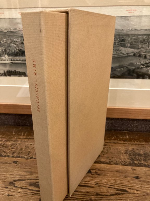 In-4° (26x15 cm), pp. 143 (11), brossura editoriale a risvolti con camicia ed astuccio cartonati con titoli in rosso. Più che buon esemplare (n°. 31/428). Edizione talloniana delle Rime a cura di Vittore Branca.