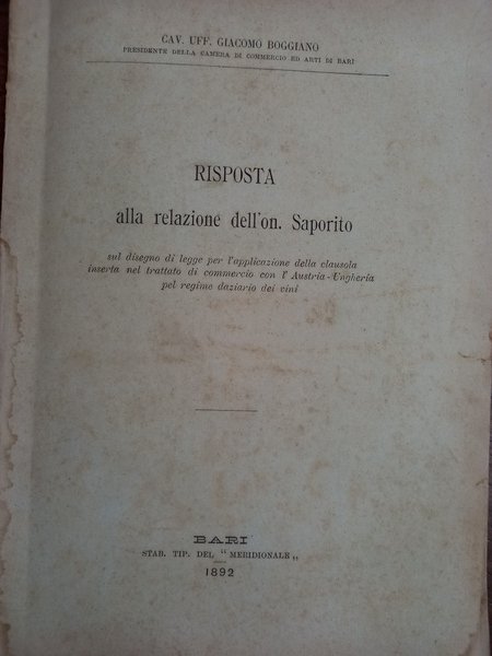 Risposta all’on. Saporito sul disegno di legge per l’applicazione della clausola nel Trattato di commercio con l’Austria - Ungheria pel regime daziario dei vini. Bari, 1892.