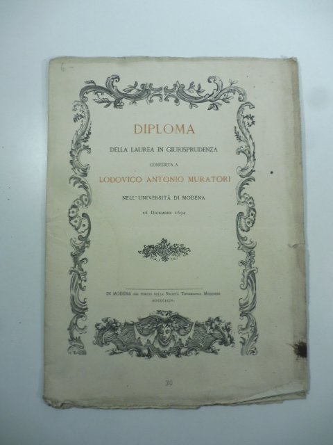 In 4 (cm 24,5 x 33), pp. 8. Brossura editoriale con piccola macchietta al piatto anteriore. Ristampa del 1894 del diploma di laurea in giurisprudenza conferito nel 1694 a Ludovico Antonio Muratori all'Universita' di Modena.