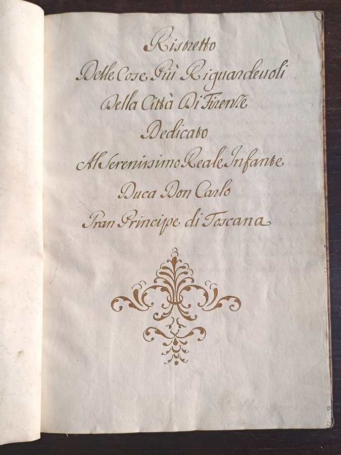 In-folio antico (cm. 30), legatura moderna in mezza pelle, taglio superiore e inferiore dorato; pp. [12] 82 in chiara calligrafia, grande fregio al frontespizio; carte in buono stato sempre ben leggibili (macchia all'ultimo fascicolo). Guida inedita di Firenze dedicata a Carlo di Borbone, verosimilmente in occasione del riconoscimento dei suoi diritti ereditari sul Granducato di Toscana, poi rinunciati a favore degli Asburgo-Lorena in cambio della corona del Regno di Napoli. Discreto esemplare. (SH3)