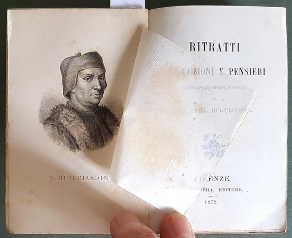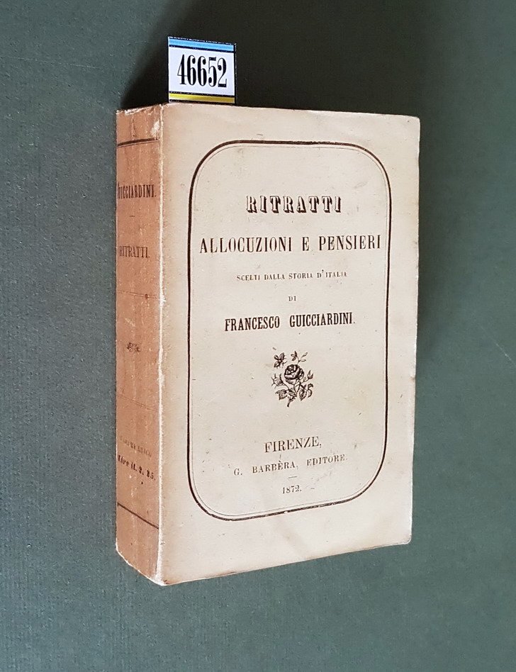 Vol. in -32 (6,5 x 10,5 cm.), brossura editoriale col. avorio con titoli in nero sul piatto e al dorso, pp. (2), 491, (1), 1 tav. incisa con ritratto di F. Guicciardini, protetto da velina, in antiporta. In buone condizioni.