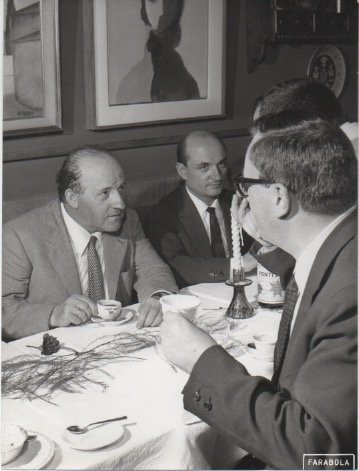 FOTOGRAFIALo scultore è ritratto seduto, al ristorante, insieme al poeta Enzo Fabiani ed Alberico Sala. Al verso della fotografia il timbro a inchiostro "Farabola / Agenzia Fotografica per la stampa / Corso Ticinese 60 - Milano […]".