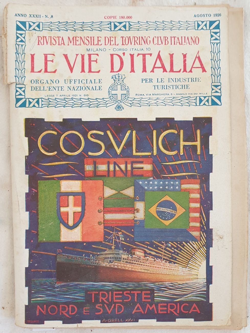 Numero del agosto 1928 della rivista di viaggi "Le vie d'Italia". All'interno: San Francesco d'Assisi, In Calabria col Touring, Automobili in dono, Rodi, Castel Valer, ORchidee, Pitture di paese alla XV Biennale veneziana ecc. In mediocri condizioni. Copertina editoriale in discrete condizioni generali con usure ai margini e dorso. Strappi marginali. Legatura assente. Pagine in buone condizioni. In 8. cm 24,5x17 cm. Pp. da 817 a 936.Number of august 1928 of the magazine "Le vie d'Italia". Inside: San Francesco d'Assisi, In Calabria with Touring, Cars in gift, Rodi, Castel Valer, ORchidee, Painting of town in the XV Biennale veneziana. In poor conditions. Editorial cover in fair general conditions with wearing in the extremities. Tears in the extremities. Binding lacks. Pages in good conditions. In 8. cm 24,5x17 cm. Pp. from 817 to 936.<BR><BR>