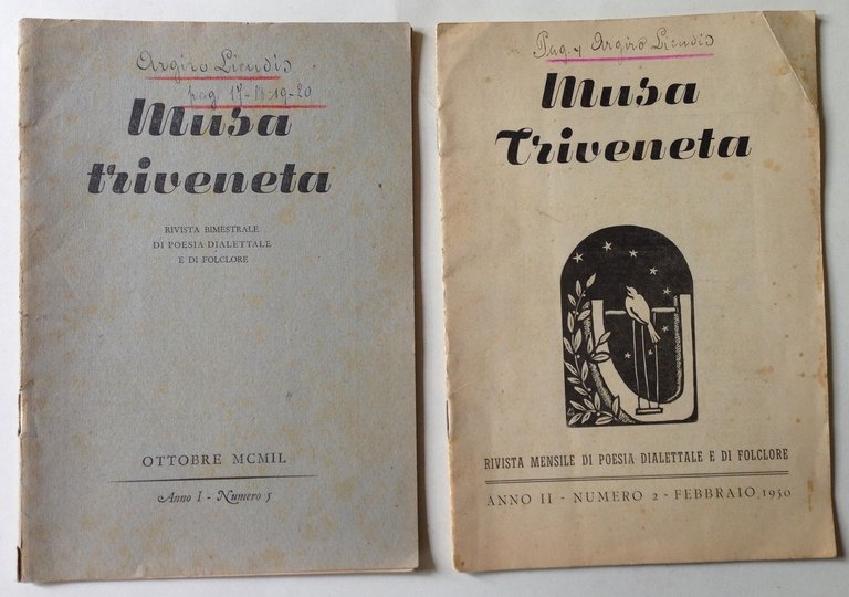 Rivista di Poesia Dialettale e di Folclore, Musa Triveneta anno 1, numero 5, ottobre 1949 anno 2, numero 2, febbraio 1950 Rivista di Poesia Dialettale e di Folclore Musa Triveneta" 1949-1950; cm 24,5x17; pp. 40, 24; annotazioni alle brossure anteriori; 2 numeri: anno 1, numero 5, ottobre 1949, anno 2, numero 2, febbraio 1950; br. ed. Condizioni di conservazione Esemplari in buono stato con leggere tracce d'uso; brossure editoriali con minime pieghette e fioriture, brossura editoriale del numero 5 staccata dal corpo del testo interni buoni, bruniti, solo minime sottolineature a matita colorata (vedi foto). OPEB.4621 MT "