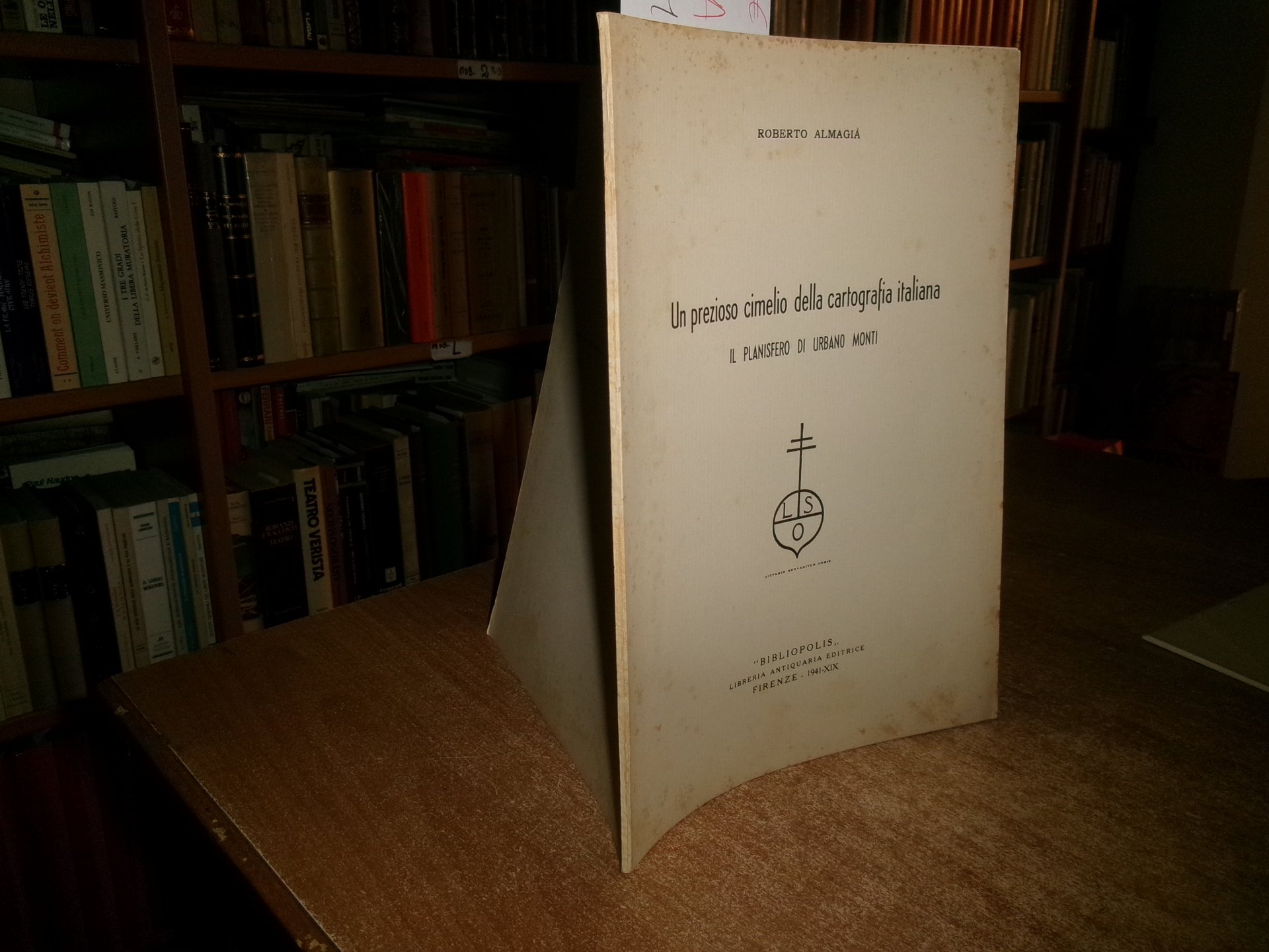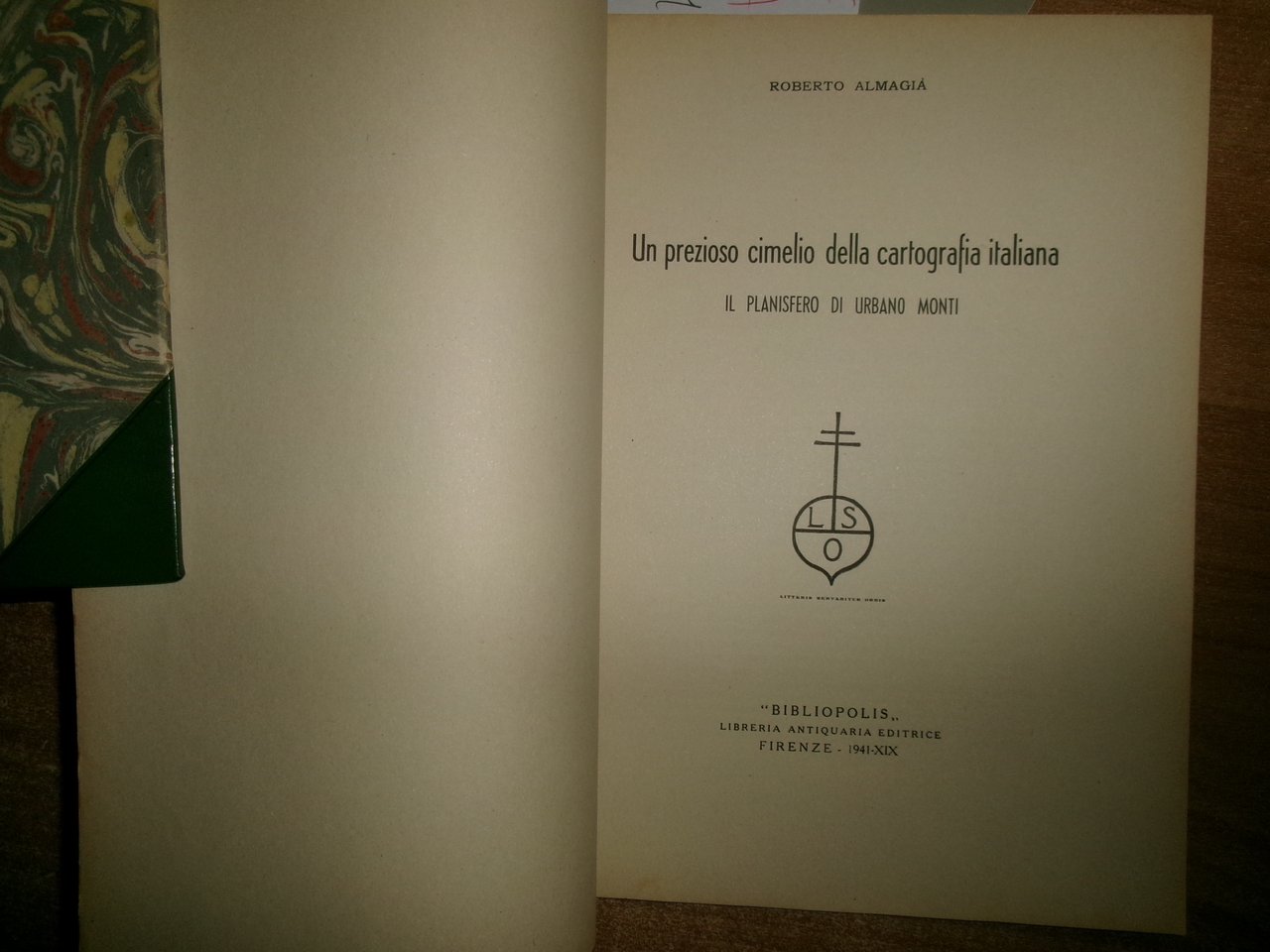 Roberto Almagià. Firenze, BIBLIOPOLIS, Libreria Antiquaria Editrice, 1941-XIX. UN PREZIOSO CIMELIO della CARTOGRAFIA ITALIANA. Il Planisfero di Urbano Monti. Estratto dal vol. XLIII, dispensa della Bibliofilia diretta da P. Giuseppe Boffito. In-8° grande, br. da pag. 156 a pag. 193 con alcune illustrazioni n.t. Ottimo stato di opuscolo raro. Uff. A - I - 1 - 2