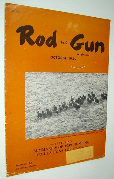 • Rod & Gun in Canada Magazine, October 1959 - Summaries of 1959 Hunting Regulations for Canada, Wood Buffalo herd running, Nice Browning rifle ad inside front cover, 1959 Hunting Laws for Canada, Play it Safe - Practice Safety!, Prairie Buffalo Stage a "Comeback", The Hunting Trail Beckons, Fall Fishing, Gun Dogs at Home, October on the Uplands, Nice photo ad promoting Quebec Hunting Sport Firearms Magazine, Back Issues