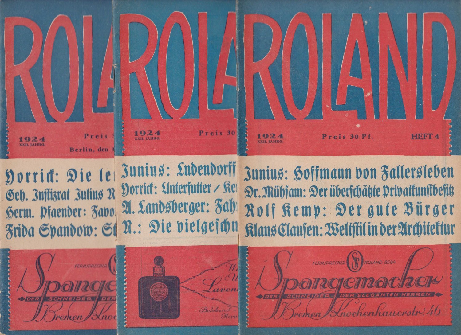 31 Hefte von 1923 und überwiegend 1924. 1923: Heft 36, 38-40. 1924: Heft 3-5, 13, 14, 17, 18, 20-22, 24-26, 29-31, 33, 35, 36, 40, 41, 43, 45, 48-51. Mit Beiträgen von Kurt Mühsam, Artur Landsberger, Moszkowski, Hans Reimann, Franz Blei, Reck-Malleczewen, Emmi Lewald, Doris Wittner u.a - - - "Der Roland von Berlin" war laut einer ihrer Untertitel eine „Wochenschrift für Kultur, Politik, Wirtschaft und Berliner Leute. Herausgeber war Walter Kaul, Chefredakteur anfangs Leo Leipziger. Zu Beginn der Weimarer Republik erschien das Blatt von 1921 bis 1925 unter dem abweichenden Titel Roland. Gesellschaft - Kunst - Börse - Film. Im Zeitraum von 1922 bis 1925 war Doris Wittner verantwortliche Redakteurin."