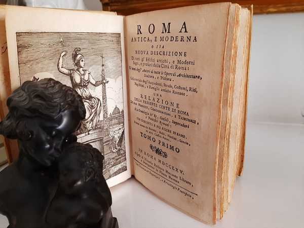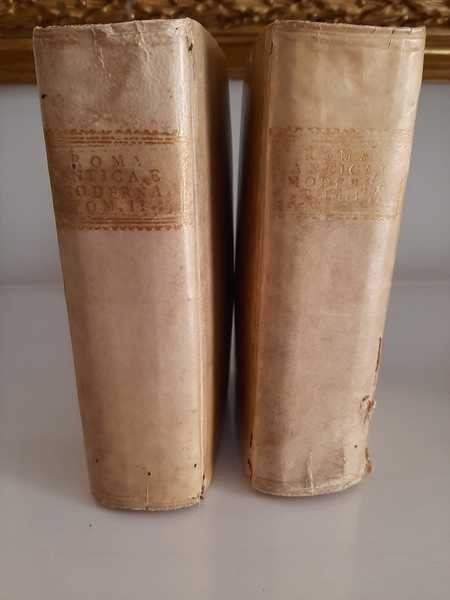 2 vol. in 16°, antiporta figurata, pp. XVI+678; pp. II+670. Legatura coeva in piena pergamena.Edizione riccamente figurata da xilografie in nero nel testo e da 19 tavole ripiegate f.t. tra cui una pianta della città di Roma. Fresco esemplare. La famosa guida romana si componeva di tre tomi (due relativi alla descrizione della città con vari itinerari e un volume spesso mancante dedicato agli usi e costumi degli antichi romani). I nostro esemplare si compone solo dei primi due tomi. Raro.