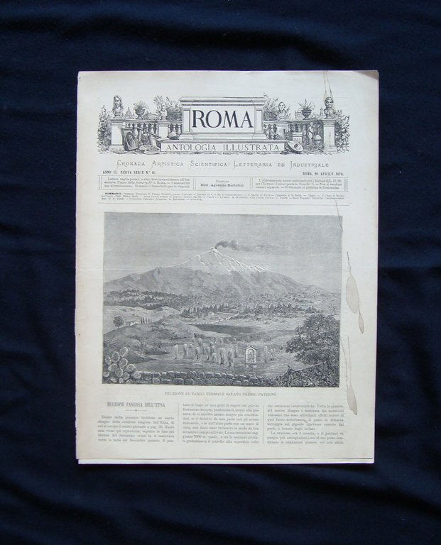 Rivista, Roma" Antologia Illustrata Cronaca Artistica Scientifica Letteraria ed Industriale Anno II Nuova Serie N° 16 20 Aprile 1879 Eruzione di fango termale presso Paterno' Tip. Tiberina, Roma, 1879; cm 35x27, pp. da 121 a 128 numerazione annuale, fogli sciolti; Rivista con ill,fot.b/n; in copertina incisione "Eruzione di Fango termale pressp Paterno'". Numero completo. Condizioni di conservazione Esemplare in buone condizioni con tracce d'uso e del tempo; piega di conservazione; copertina con tracce di macchie di inchiostro e strappetto al dorso di circa 10 cm. Numero Completo. SC03.D14136F blu "