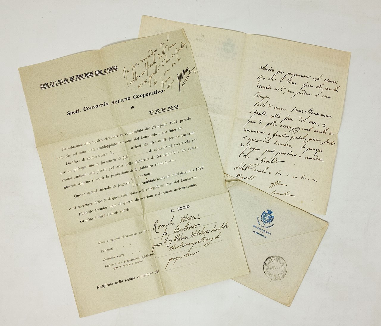 Insieme composto da:; A- una lettera manoscritta (su carta intestata della 'Camera dei deputati') firmata a mano 'Romolo' (indirizzata al cognato); B- un documento originale del 'Consorzio Agrario Cooperativo di Fermo' ('Scheda per i soci che non hanno vecchie azioni di fabbrica') compilata a mano da Romolo Murri e con un appunto autografato ('R. Murri') dello stesso; C- La busta intestata ('Camera dei Deputati') con bollo postale '5 maggio 1921'.; Stato di conservazione: I due documenti presentano linee di piegatura ma risultano, comunque, decisamnte ben conservati. La busta presenta un taglio (causato dalla sua apertura) e manca del francobollo. DOCUMENTI RARI E INTERESSANTI, DA COLLEZIONE.