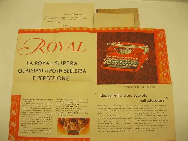 Bifolio pubblicitario cm 40 x 29, che propaganda la nuova Royal portatile. Pubblicita' a colori di gusto deco' che illustra diffusamente il prodotto. Si acclude busta di spedizione, circolare e cartolina pubblicitaria.