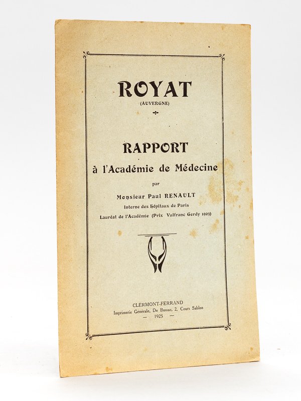 1 brochure in-8, Imprimerie Générale De Bussac, Clermont-Ferrand, 1925, 15 pp. Etat très satisfaisant (lég. rouss. sur couv., parfait état par ailleurs). Rare.