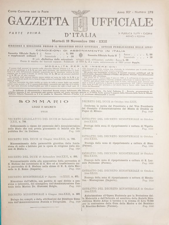 RSI Gazzetta Ufficiale d'Italia N. 278 - 1944