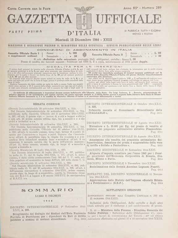 RSI Gazzetta Ufficiale d'Italia N. 289 - 1944
