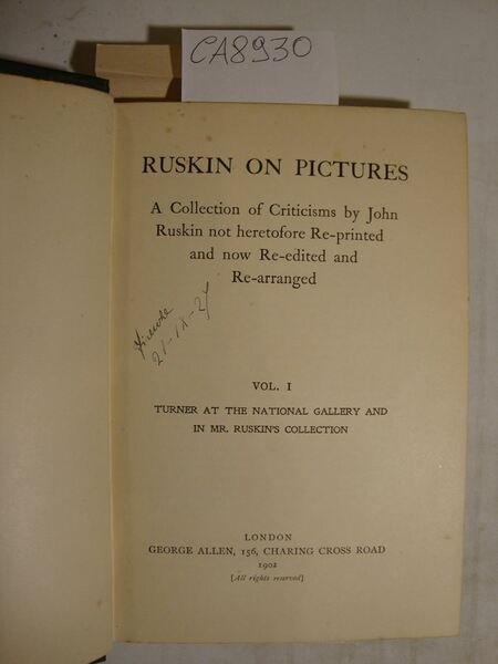 Ruskin on pictures - A Collection of Criticism by John Ruskin not heretofore Re-printed and now Re-edited and Re-arranged - Vol. I (Turner at the National Gallery and in Mr. Ruskin's Collection)