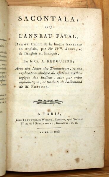 Sacontala ou L'Anneau Fatal. Drame traduit de la langue Sanskrit en Anglais par Sir W. M. Jones, et de l'anglais en français par le Cit. A. Bruguière; Avec des Notes des Traducteurs, et une explication abrégée du système mythologique des Indiens, mise par ordre alphabétique, et traduite de l'allemand de Forster