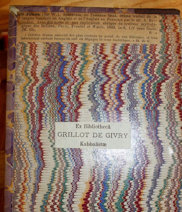 In 8°, pp. xvj, 314, (2). Leg. ottocentesca mezza pelle. Dorso a nervetti con titoli oro (leggermente schiarito). Tagli marmorizzati. Copia in buono stato. Edizione originale. Copia appartenuta all’esoterista Émile Grillot de Givry, con la sua firma su una carta di guardia e l’etichetta di possesso a stampa applicata al primo contropiatto