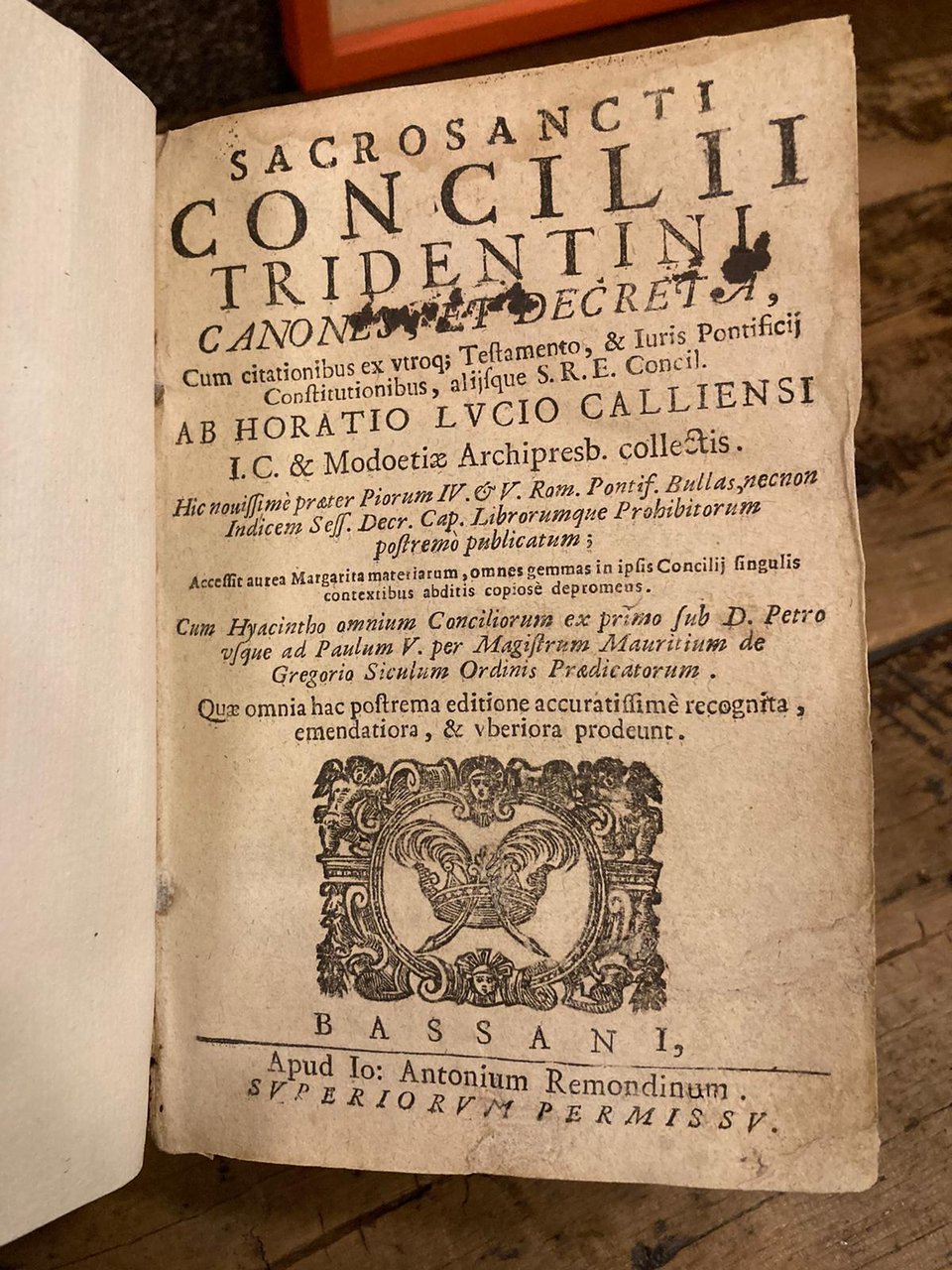 2 parti autonomamente numerate, e con autonomo frontespizio, in un vol. in-8° (165x110mm), pp. (16), 308, (42) di indice ('Margarita Concilii Tridentini Omnes Gemmas', compilazione di Maurizio Di Gregorio), 72. La seconda parte, compresa in queste 72 pp., è di 'Index Librorum Prohibitorum cum regulis confectis per Patres à Tri. Synodo delectos, auctoritate Pii IV primum editus, posteà verò à Xisto Quinto auctus; et nunc demum S. D. N. Clementis Papae VIII iussu recognitus, & publicatus. Instructione adiecta, De exerquenda prohibitionis, deque sincerè emendandi, imprimendi Libros ratione'. Legatura coeva p. pergamena rigida con titolo calligrafato in antico al dorso. Titolo manoscritto anticamente al taglio di piede. Vignette xilografiche ai frontespizi con corone, recanti delle piume al loro interno, entro cornici a putti e grottesche. Testatine, finalini e capilettera ornati su legno, una xilografia a p. pagina di fronte alla p. 1 della prima parte, al verso dell'ultima carta nn. di 'Bulla Indictionis', con raffigurazione della resurrezione di Cristo entro cornice riccamente ornata a grottesche. Ampi indici. Lavori di tarlo rimarginati al frontespizio e alle prime 3 cc. della prima parte, bruniture e fioriture sparse. Rara edizione remondiniana, riveduta e accresciuta, priva di anno di stampa (la Vinciana la data al 1699, l'indice SBN al 1698), degli statuti e decreti del Concilio di Trento, qui ordinati e pubblicati per le cure di Orazio Lucio Calliense, fedele cronaca di ogni singola sessione dell'evento della storia ecclesiastica che dette di fatto avvio alla Controriforma. Di grande interesse l'Index Librorum Prohibitorum' che costituisce la seconda parte. 'When printing was invented in the fifteenth century the Church, apprehending the threat to her domination over thought and belief, endeavoured to intensify her control over books, and in 1557 the Inquisition under Pope Paul IV drew up the first Index Librorum Prohibitorum The Index has been revised from time to time and now lists some four thousand books forbidden throughout the world' (Craig, Banned Books of England, pp.18-19). Catalogo Vinciana, 4997. Sulla storia dell'Index, v. L. Petit, 'L'Index, son histoire, ses lois, sa force obligatoire', Paris, 1886; J. Hilgers, 'Der Index der verbotenen Bücher', Friburgo, 1904.