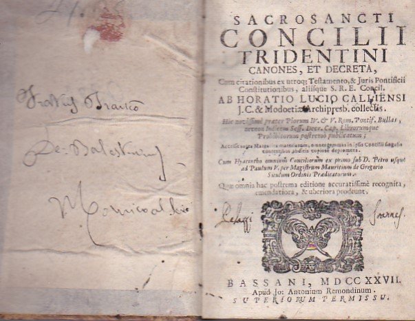 Sacrosancti Concilii Tridentini Canones, et Decreta, cum citationibus ex utroq. Testamento, & Juris Pontificii Constitutionibus, aliisque S. R. E. Concil. Ab Horatio Lucio Calliensi J.C. & Modoetiae archipresb. collectis. Hic novissimè praeter Piorum IV & V Rom. Pontif. bullas, necnon Indicem sess. decr. cap. librorumque prohibitorum postremò publicatum; accessit aurea Margarita materiarum, omnes gemmas in ipsis Concilii singulis contextibus abditis copiosè depromens. Cum Hyacintho omnium.