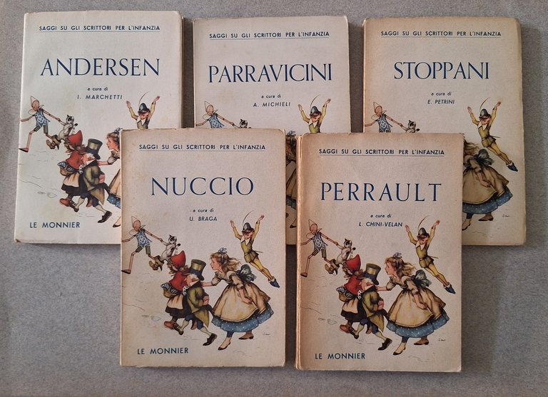 SAGGI SU GLI SCRITTORI PER L'INFANZIA ANDERSEN PERRAULT STOPPANI NUCCIOPARRAVICINI  LE MONNIER 5 VOL. In 8°, legatura editoriale, sovracopertina illustrata.