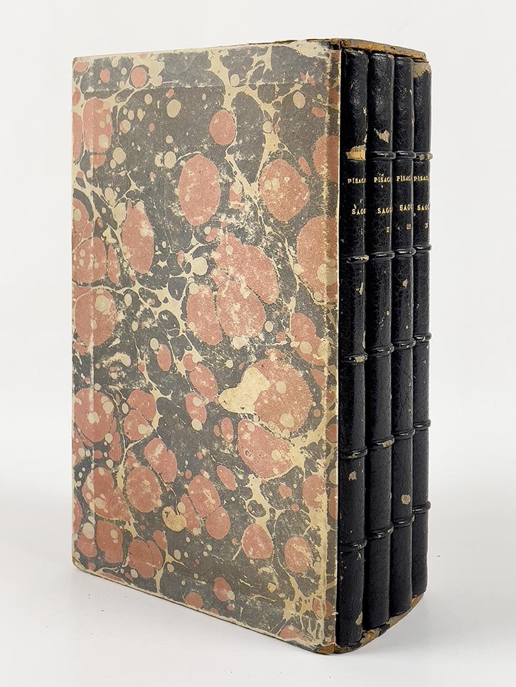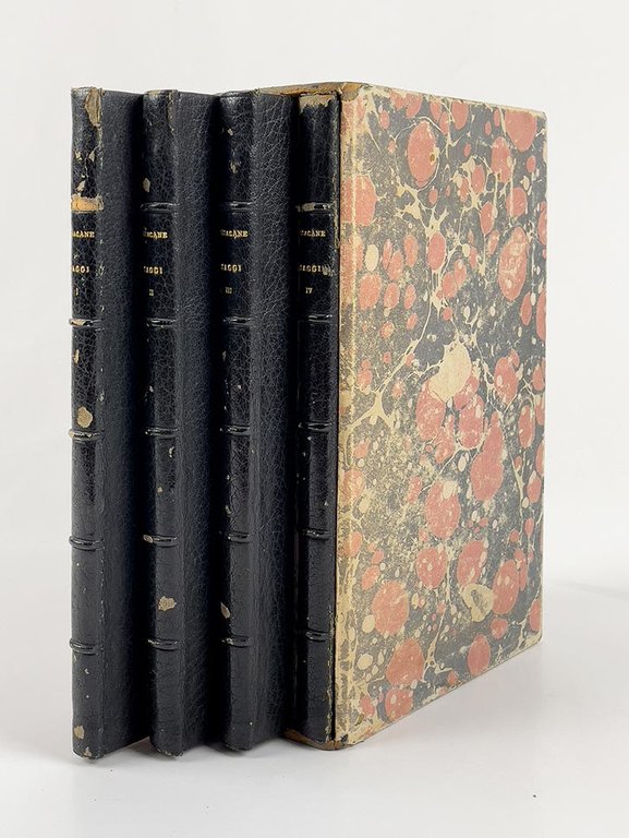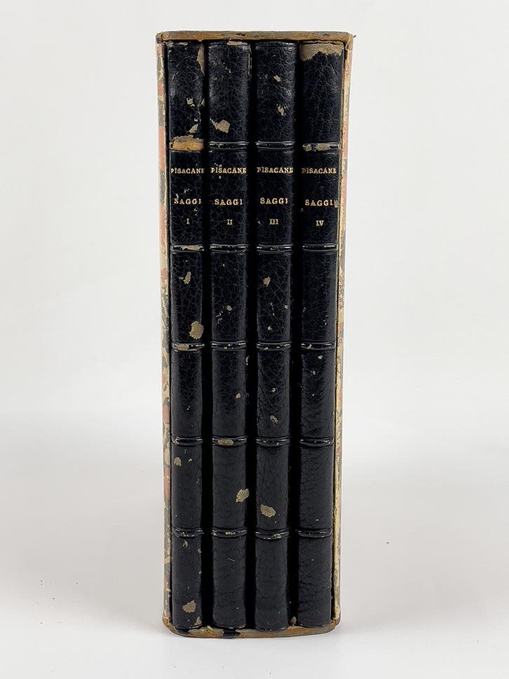 LIBROEdizione originale.CON AUTOGRAFO.Esemplare a pieni margini, parzialmente intonso, conservato in bella legatura con cofanetto coordinato: la copia dell’ingegnere Ettore Scalabrini, che sarà incaricato poco dopo dal governo del progetto di ferrovia Sicignano-Castrocucco, strada ferrata che attraversava proprio i luoghi della sfortunata spedizione in cui perse la vita Pisacane, pregiata dalla dedica autografa di Silvia Pisacane Nicotera, datata 1875. Silvia (1853-1888), figlia di Pisacane, era stata adottata dal Nicotera, ferito nella spedizione accanto a Carlo ma fra i pochissimi sopravvissuti al massacro; come noto, fu Silvia a perorare la sorte di Carlo Cafiero dopo i moti socialisti del Matese.Nell’autografo conservato a Roma, l’opera risulta chiusa il 7 settembre 1856 e annunciata il 25 ottobre sul giornale mazziniano «Italia e popolo», con l’anticipazione di alcune puntate del quarto saggio nel mese di novembre. Nel luglio del 1857, tuttavia, l’autore perdeva la vita nel corso della fallimentare Spedizione di Sapri: l’edizione fu dapprima affidata a Carrano, Cosenz e Mezzacapo (e a loro vennero attribuiti i «Cenni sulla vita di Carlo Pisacane» pubblicati in apertura del primo volume, in realtà di autore incerto ancora oggi). Ritiratosi il terzetto, condusse a termine l’edizione l’avvocato Enrico Rosmini. Ciascun volume reca il suo sottotitolo, rispettivamente «Cenni storici», «Cenni storici militari», «La Rivoluzione» e «Ordinamento dell’esercito italiano». Nell’«Indice generale» del quarto tomo (pagina 165) viene registrato in apertura uno scritto («Delle ragioni che mi hanno indotto ad intraprendere questo lavoro») che invece non fu mai inserito (cfr. l’edizione critica di Aldo Romano, Edizioni Avanti, 1957, pagina IX). -- I «Saggi» di Pisacane rappresentano la prima opera dichiaratamente «socialista» scritta da un esponente della rivoluzione italiana, nell’ambito della corrente repubblicana: «discuteva problemi ideologi inediti per il dibattito italiano: l’idea di una rivoluzione sociale capace di superare anche la proprietà privata, l’analisi degli interessi economici e sociali come leva per i cambiamenti politici. Il nucleo fondamentale era l’approfondimento del disegno proposto in “Guerra combattuta in Italia”: la questione sociale era presentata come potenziale soluzione della crisi italiana, la nazionalità poteva formarsi solo autonomamente e senza lo straniero, combinando la lotta per la libertà politica a quella contro lo sfruttamento. Temi che sarebbero stati al centro della fortuna di Pisacane nei dibattiti storiografici e soprattutto politici della seconda metà del Novecento» (Carmine Pinto, voce DBI vol. 84, 2015).