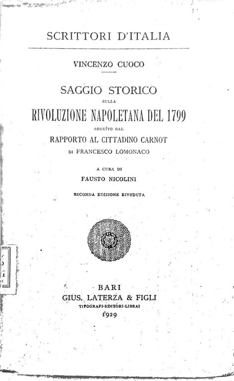 In-8 p., brossura, pp. (4),396. Seguito dal "Rapporto al cittadino Carnot" di Francesco Lomonaco. Seconda edizione riveduta. Vol. 43 della Collana "Scrittori d'Italia". Ben conservato.