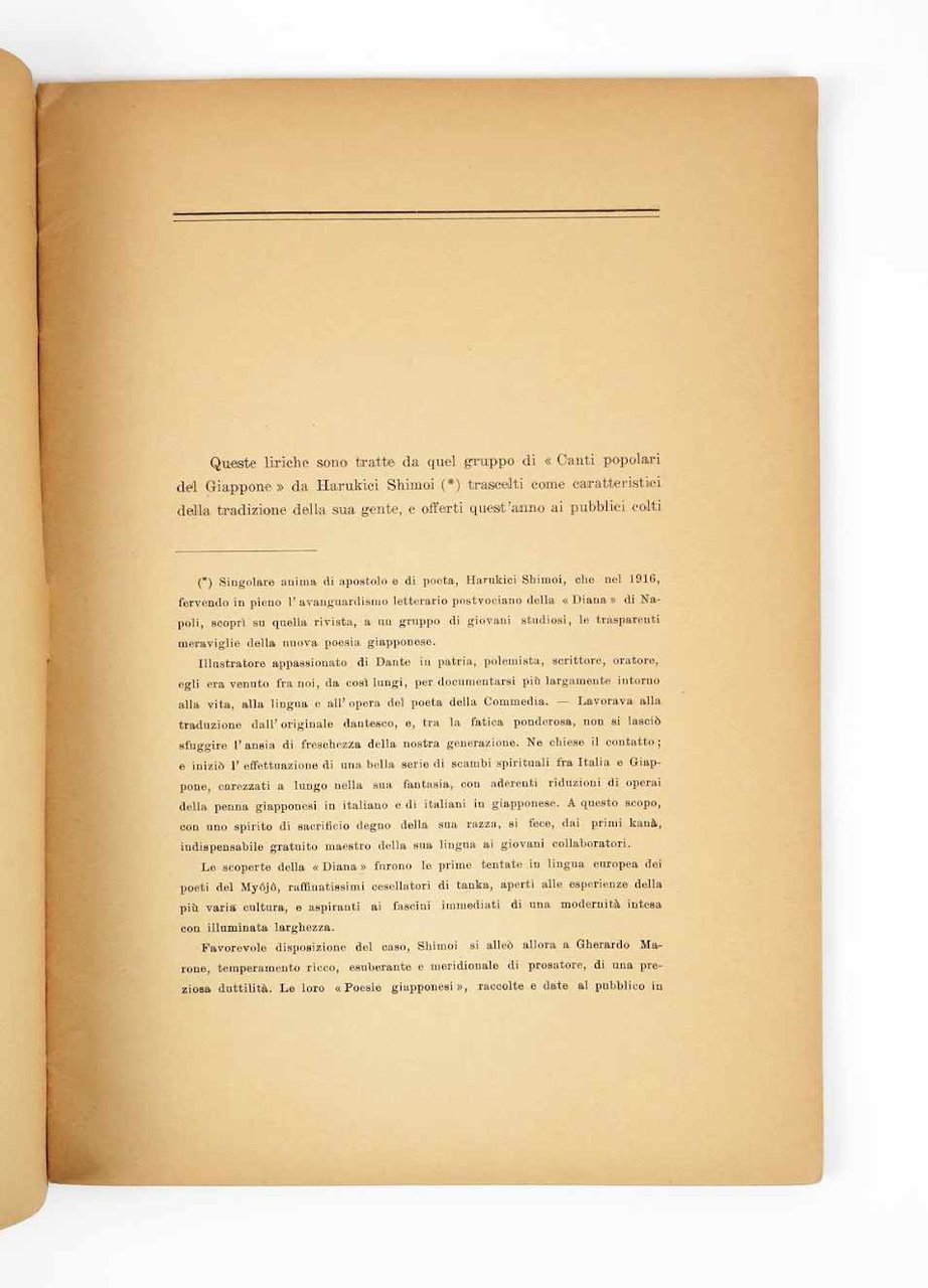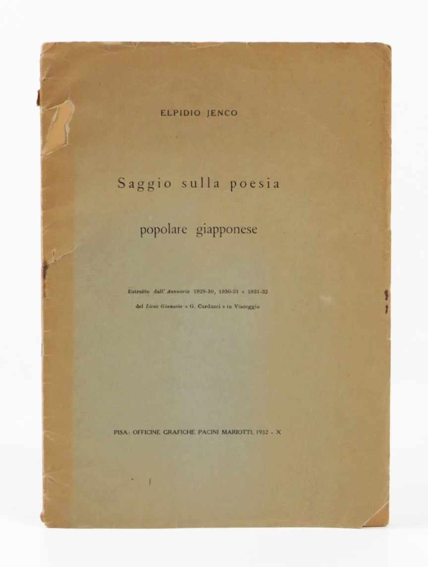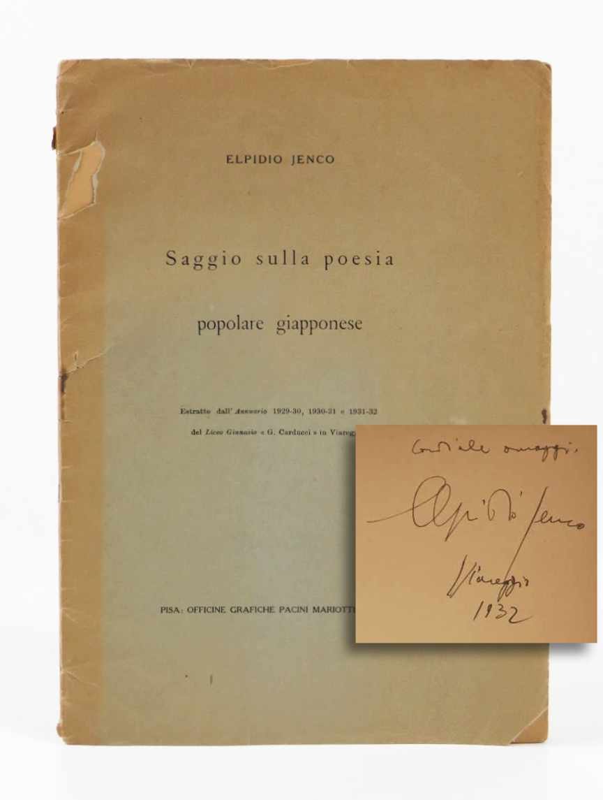 LIBROEdizione originale.CON AUTOGRAFO.Esemplare pregiato dalla dedica autografa dell’autore che scrive «Cordiale omaggio | Elpidio Jenco | Viareggio 1932». Uniforme brunitura interna e lacune marginali alla brossura, senza perdite di testo; nel complesso fragile fascicolo ben conservato in astuccio conservativo su misura.Rarissimo contributo sulla poesia giapponese steso dall’appassionato Elpidio Jenco, che era stato tra gli animatori della prima rivista di cultura giapponese pubblicata in Italia, «Sakurà», fondata e diretta da Harukichi Shimoi nel 1921. Proprio a Shimoi è dedicata una lunga rievocazione in nota all’inizio del saggio: «Mezzo efficacemente divulgatore “Sakurà”, la fresca rassegna di cultura italo-giapponese, di interesse europeo, di cui ho l’orgoglio di essere stato, a designazione di Shimoi, il redattore-capo, durante il suo periodo più attivo! Essa non fu un bazar orientale di trite curiosità esotiche, ma un vero focolaio di bellezza che ci si impose al cuore sempre più perché ci aprì la strada a gioie inattese di emozioni, a scoperte di volti fraterni, a comprensioni di spiriti che avevamo creduti distanti [.] tracce ed echi e riflessi se ne trovano, volere o non volere, in certi atteggiamenti della nostra lirica più viva. Quanto v’ha oggi, oltralpe, di fervore intorno al Giappone creativo è una conseguenza di quel fervore». -- Al saggio seguono traduzioni di circa trenta canti della tradizione nipponica. Il saggio esce come estratto dall’annuario del Liceo classico Carducci di Viareggio, del quale lo Jenco fu insegnante e preside.