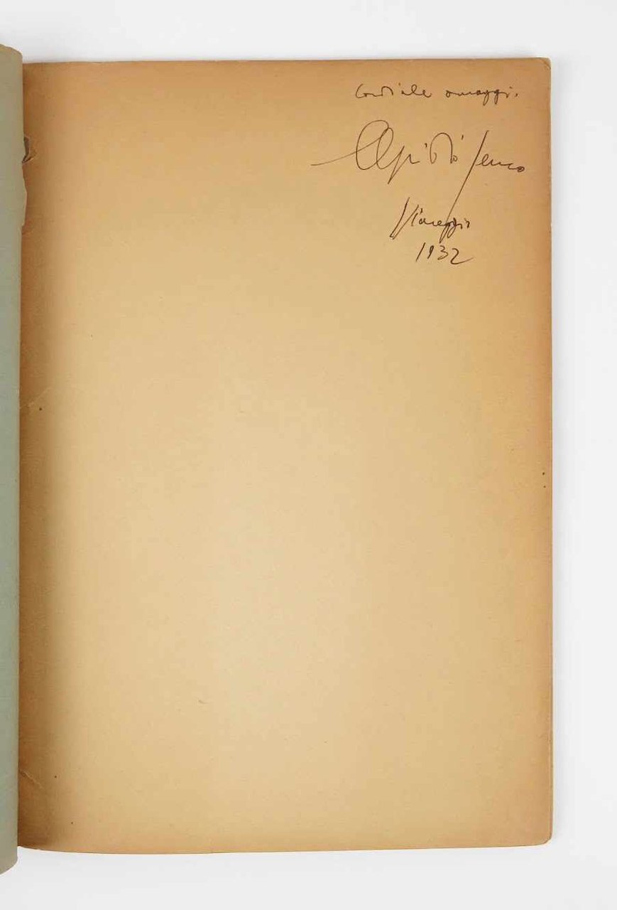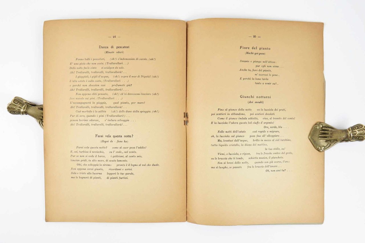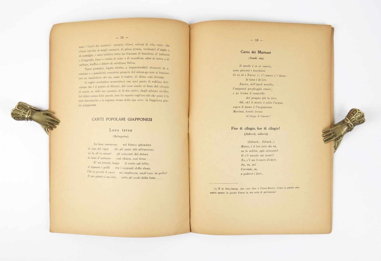 LIBROEdizione originale.CON AUTOGRAFO.Esemplare pregiato dalla dedica autografa dell’autore che scrive «Cordiale omaggio | Elpidio Jenco | Viareggio 1932». Uniforme brunitura interna e lacune marginali alla brossura, senza perdite di testo; nel complesso fragile fascicolo ben conservato in astuccio conservativo su misura.Rarissimo contributo sulla poesia giapponese steso dall’appassionato Elpidio Jenco, che era stato tra gli animatori della prima rivista di cultura giapponese pubblicata in Italia, «Sakurà», fondata e diretta da Harukichi Shimoi nel 1921. Proprio a Shimoi è dedicata una lunga rievocazione in nota all’inizio del saggio: «Mezzo efficacemente divulgatore “Sakurà”, la fresca rassegna di cultura italo-giapponese, di interesse europeo, di cui ho l’orgoglio di essere stato, a designazione di Shimoi, il redattore-capo, durante il suo periodo più attivo! Essa non fu un bazar orientale di trite curiosità esotiche, ma un vero focolaio di bellezza che ci si impose al cuore sempre più perché ci aprì la strada a gioie inattese di emozioni, a scoperte di volti fraterni, a comprensioni di spiriti che avevamo creduti distanti [.] tracce ed echi e riflessi se ne trovano, volere o non volere, in certi atteggiamenti della nostra lirica più viva. Quanto v’ha oggi, oltralpe, di fervore intorno al Giappone creativo è una conseguenza di quel fervore». -- Al saggio seguono traduzioni di circa trenta canti della tradizione nipponica. Il saggio esce come estratto dall’annuario del Liceo classico Carducci di Viareggio, del quale lo Jenco fu insegnante e preside.